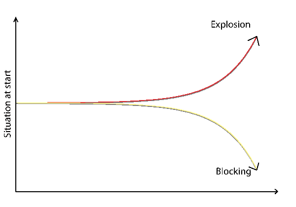 The second image shows the use of positive feedback. They too start of at a random point and react to an addition or subtraction in the same way, by adding and subtracting respectively. Unlike negative feedback there is no equilibrium, no goal to be aimed at. Just a repetition that leads to unknown states that eventually become unstable or unable to function anymore. But before reaching a critical point everything seems to be running smoothly, and that’s exactly what everyone that adopts a positive-feedback-only way of thinking aims to do: extend the time before that point is reached while reaping benefits in the meantime.
